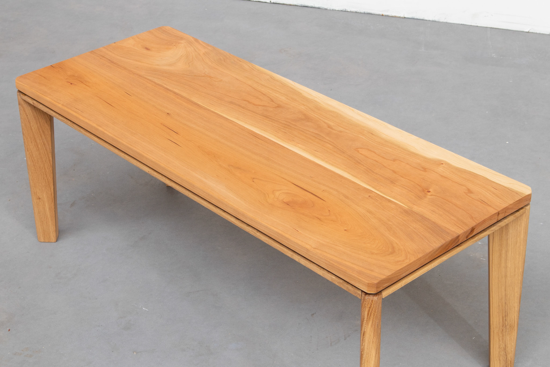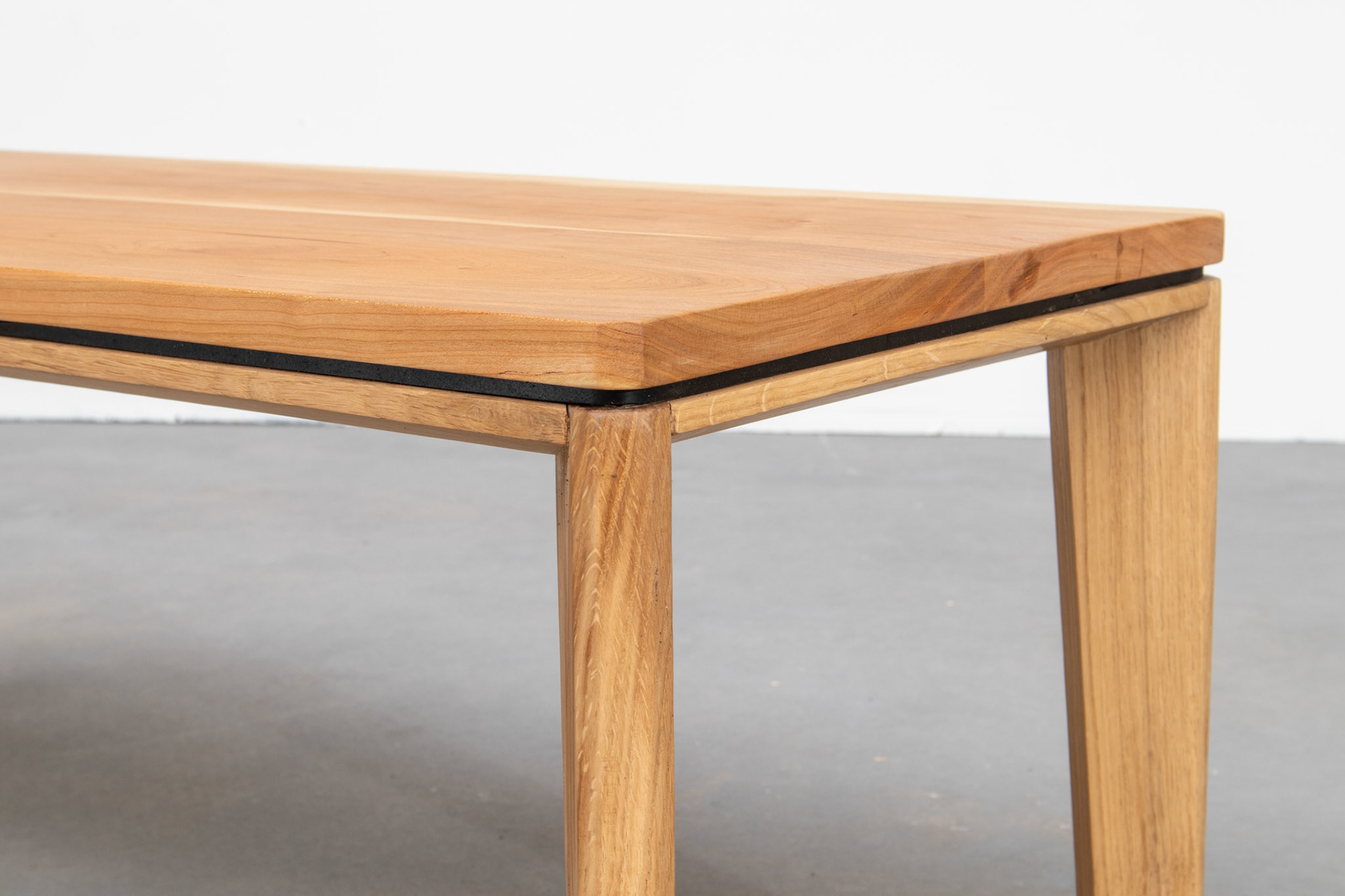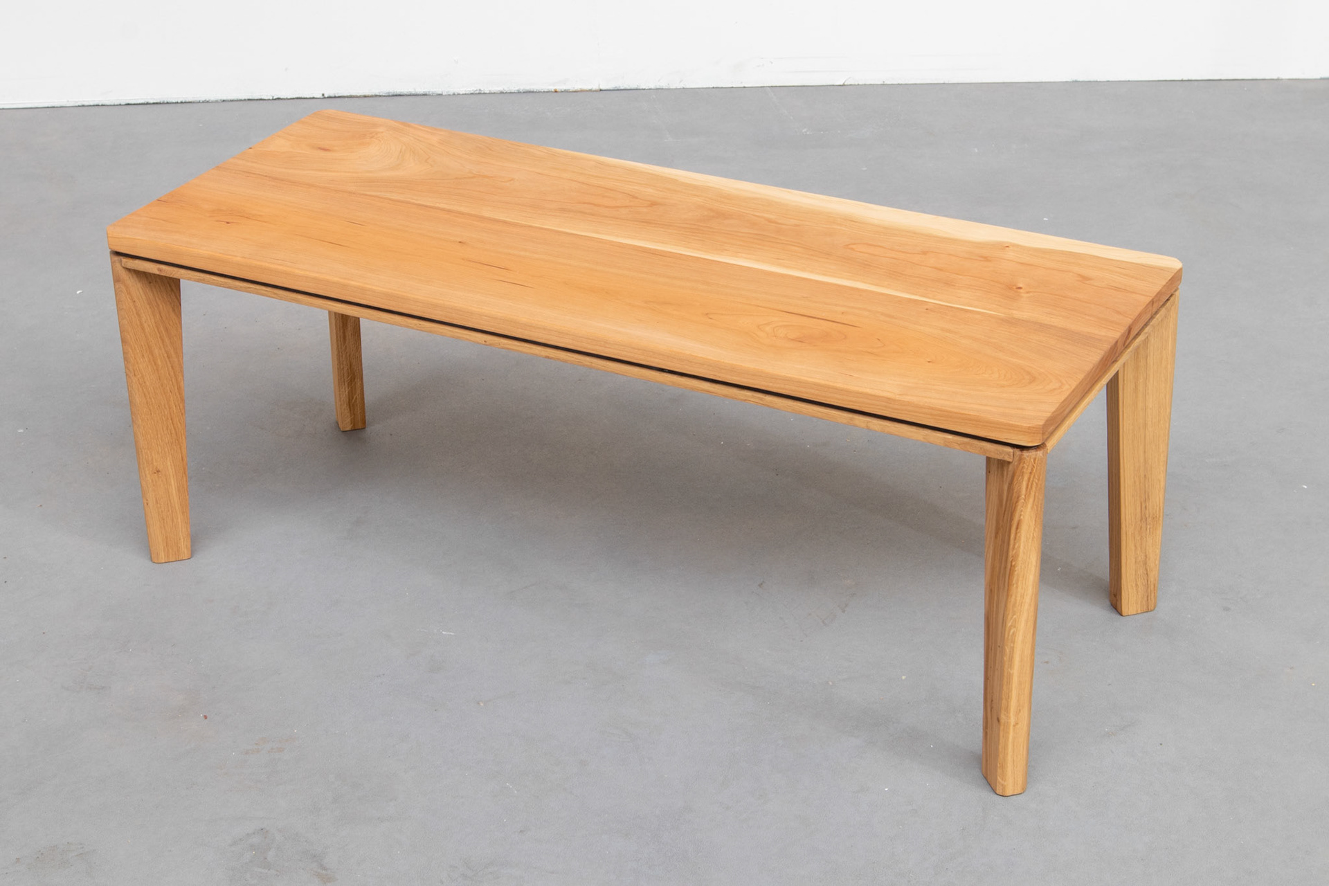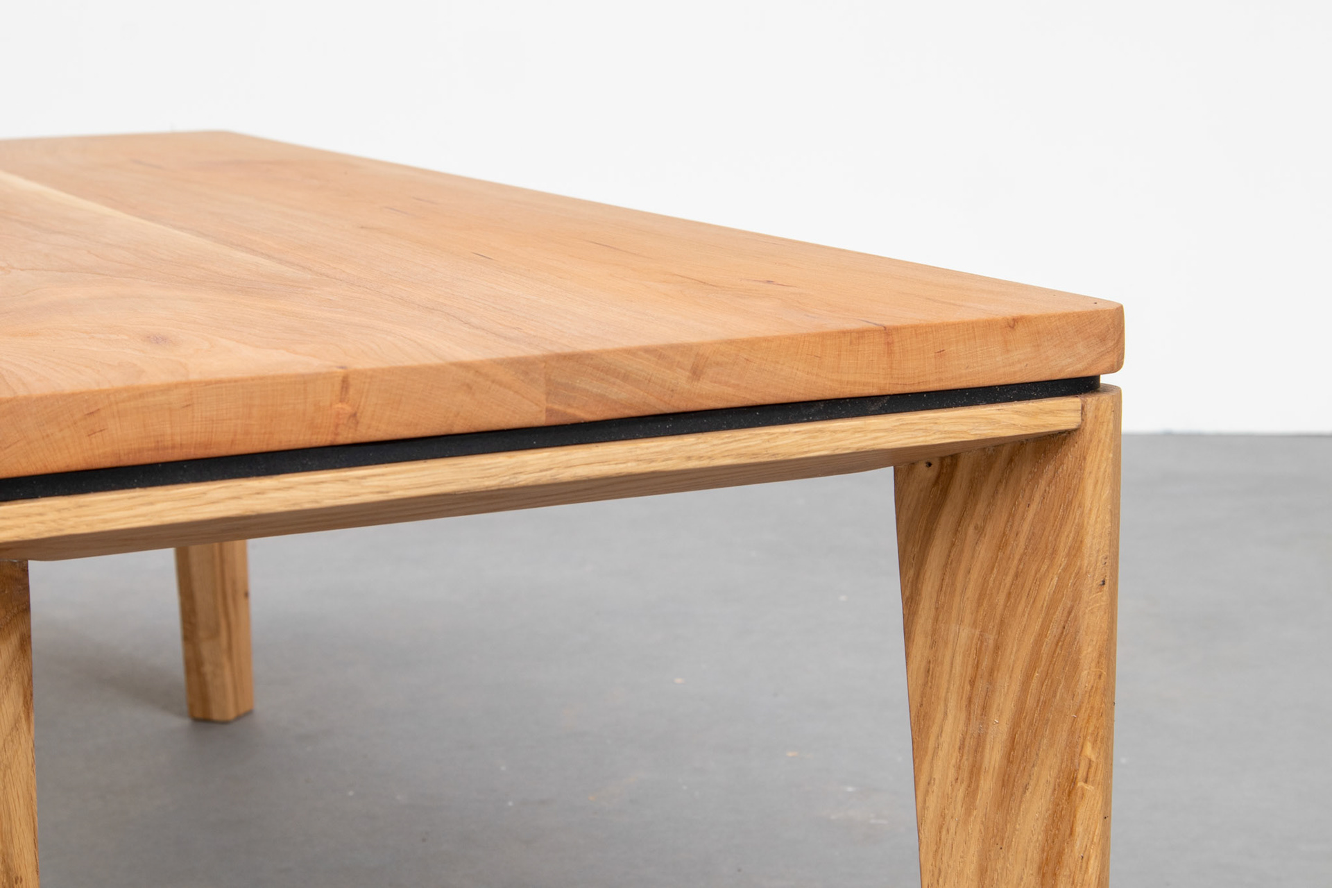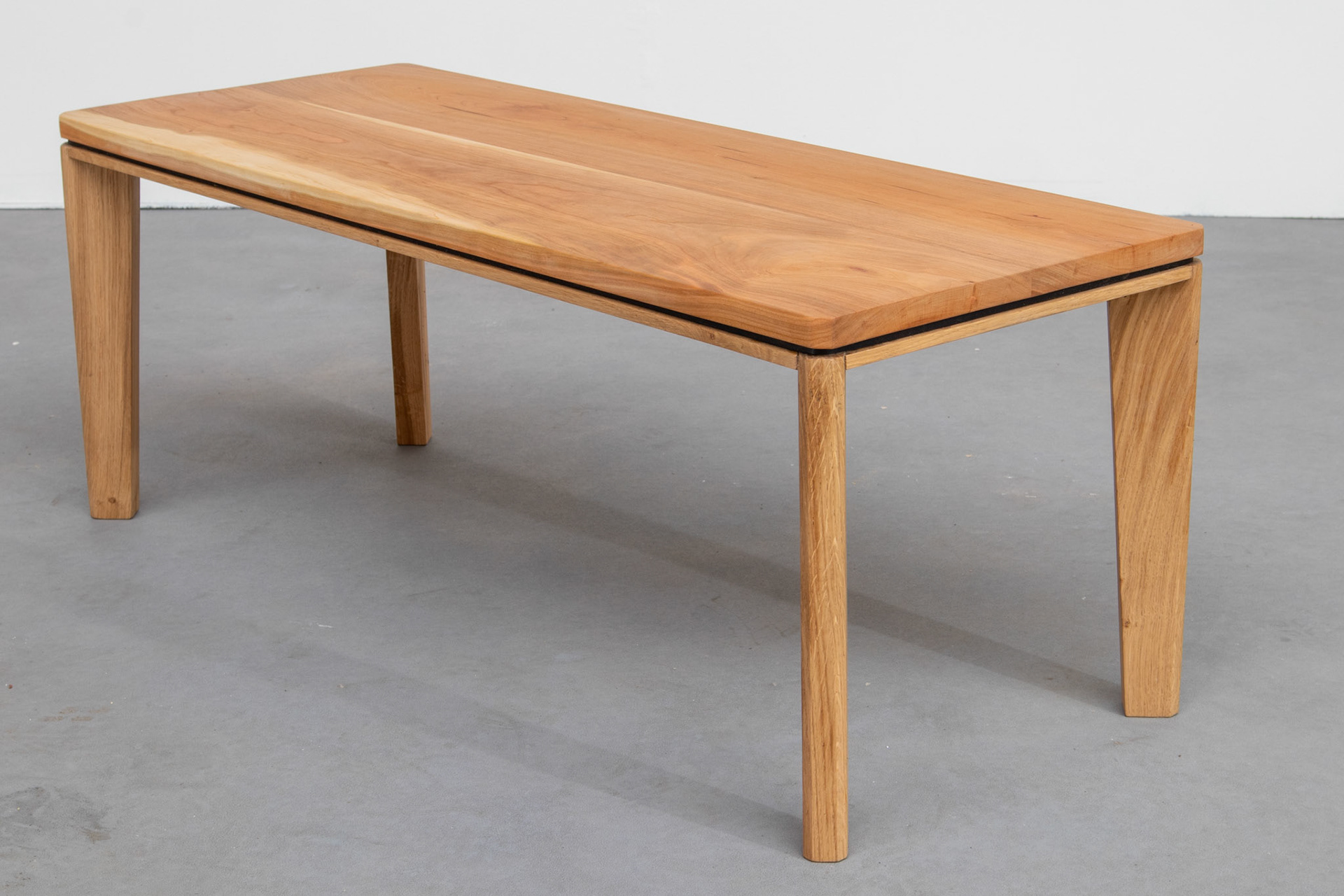 Low pofile coffee table, made from solid cherry top, oak legs and skirt, and a rubber detail. Finished with clear hardwax oil