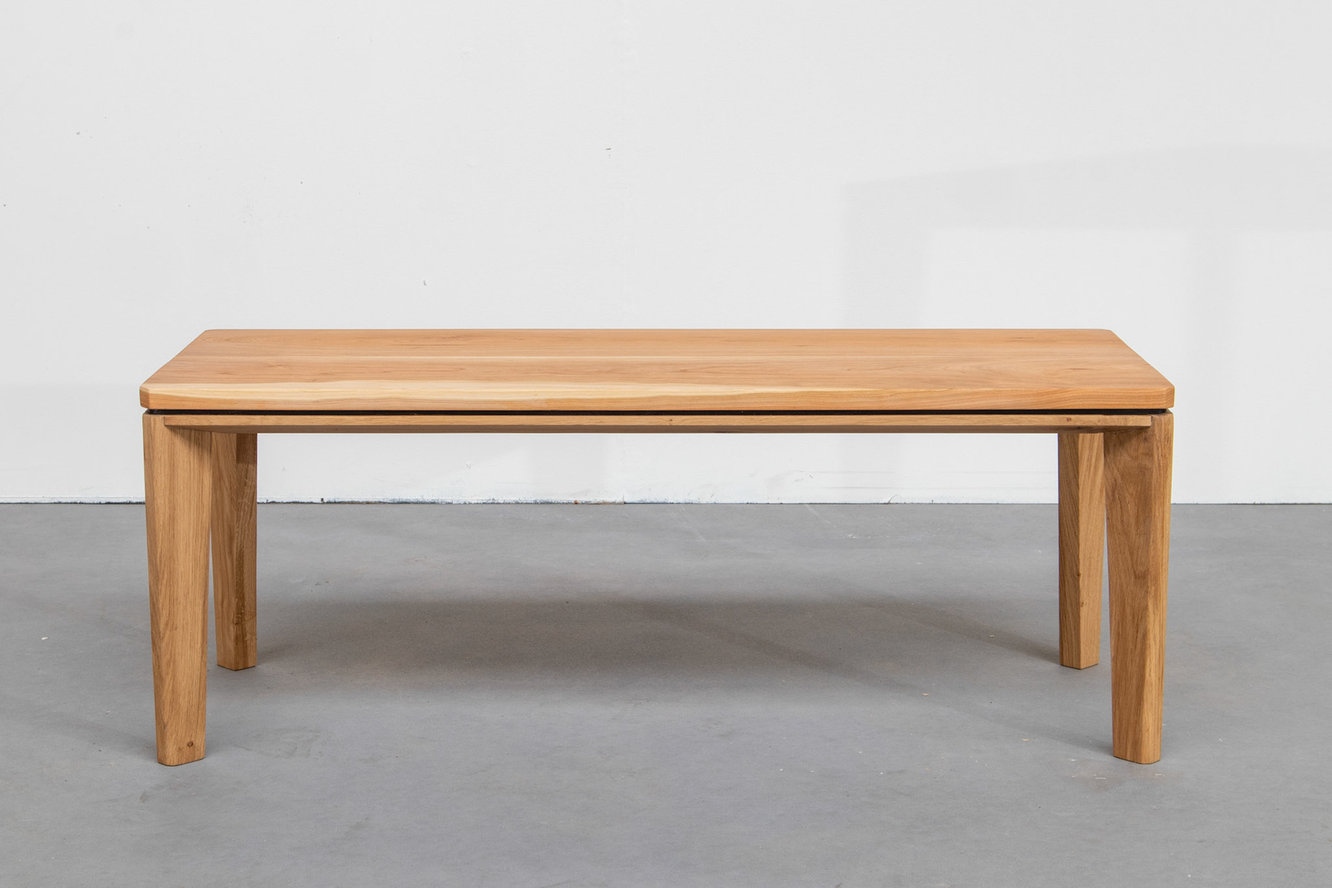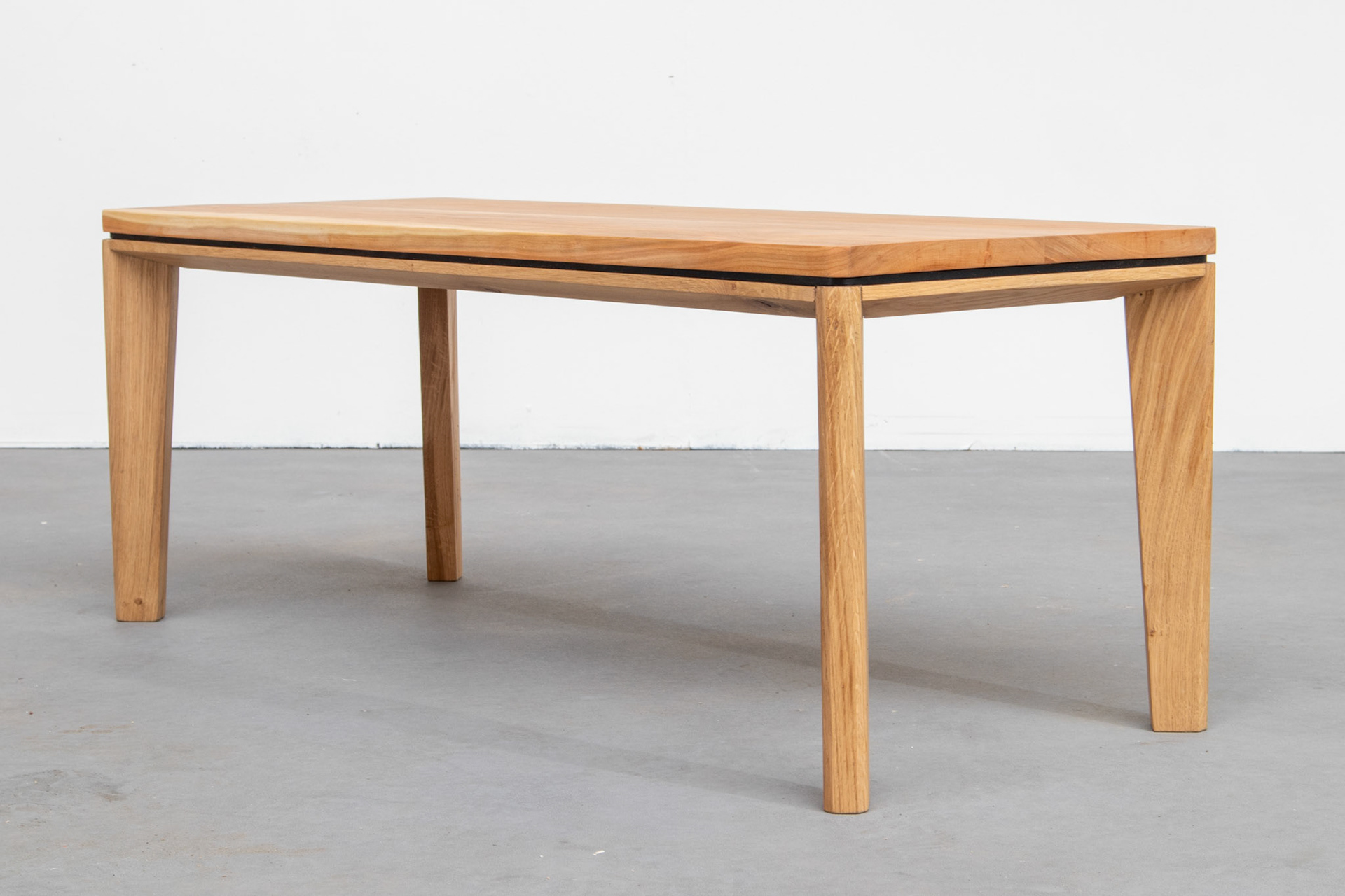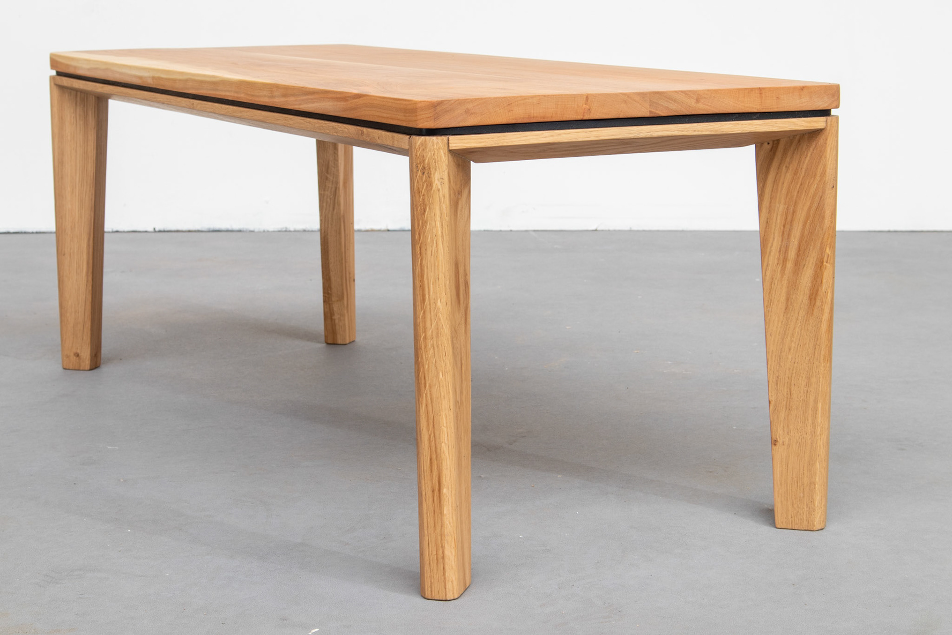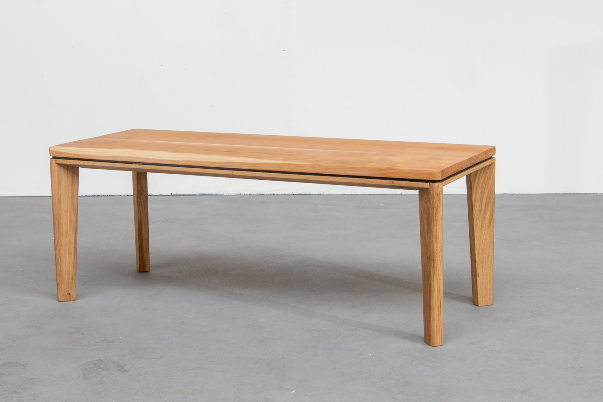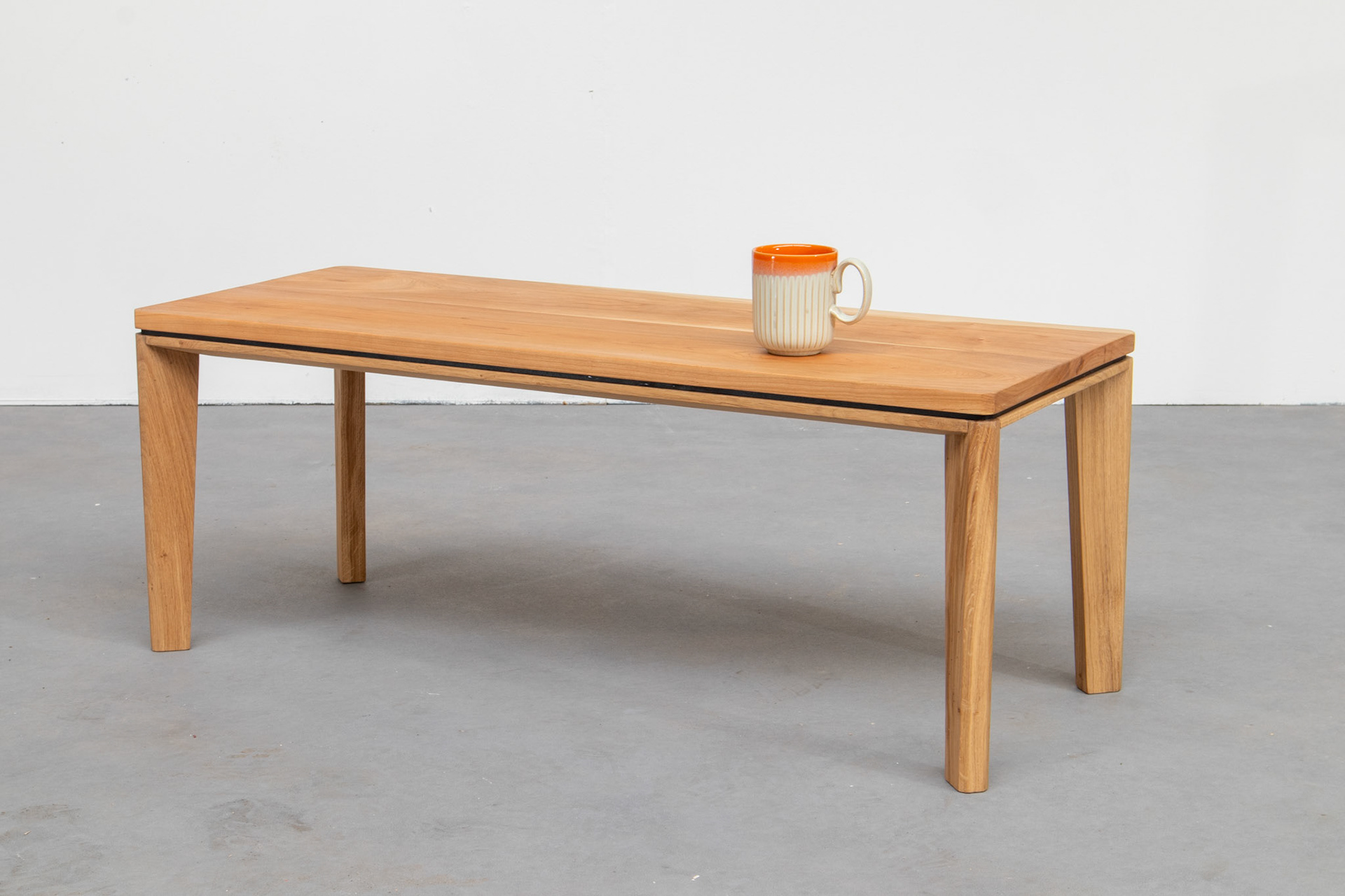 Low pofile coffee table, made from solid cherry top, oak legs and skirt, and a rubber detail. Finished with clear hardwax oil