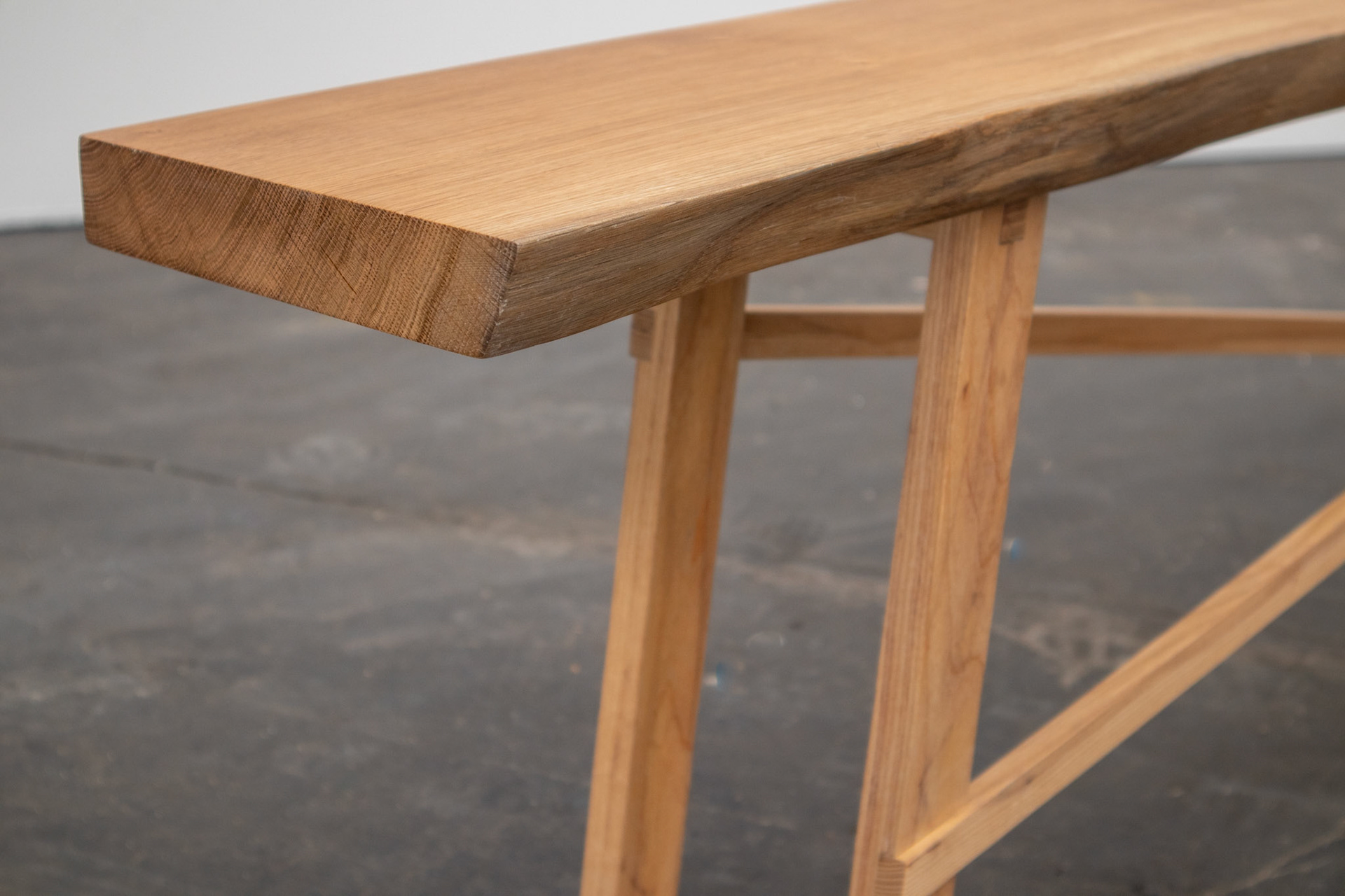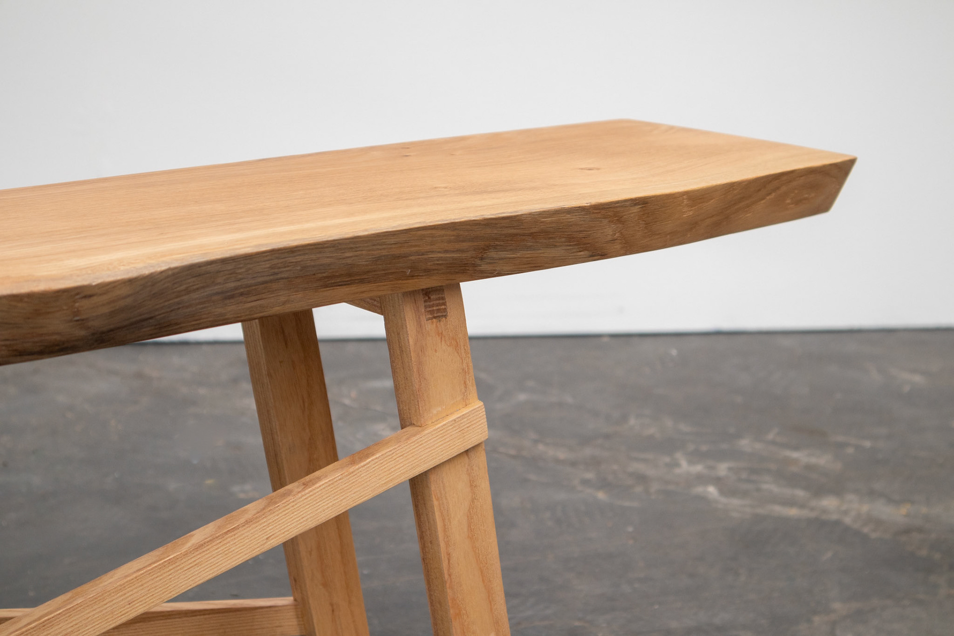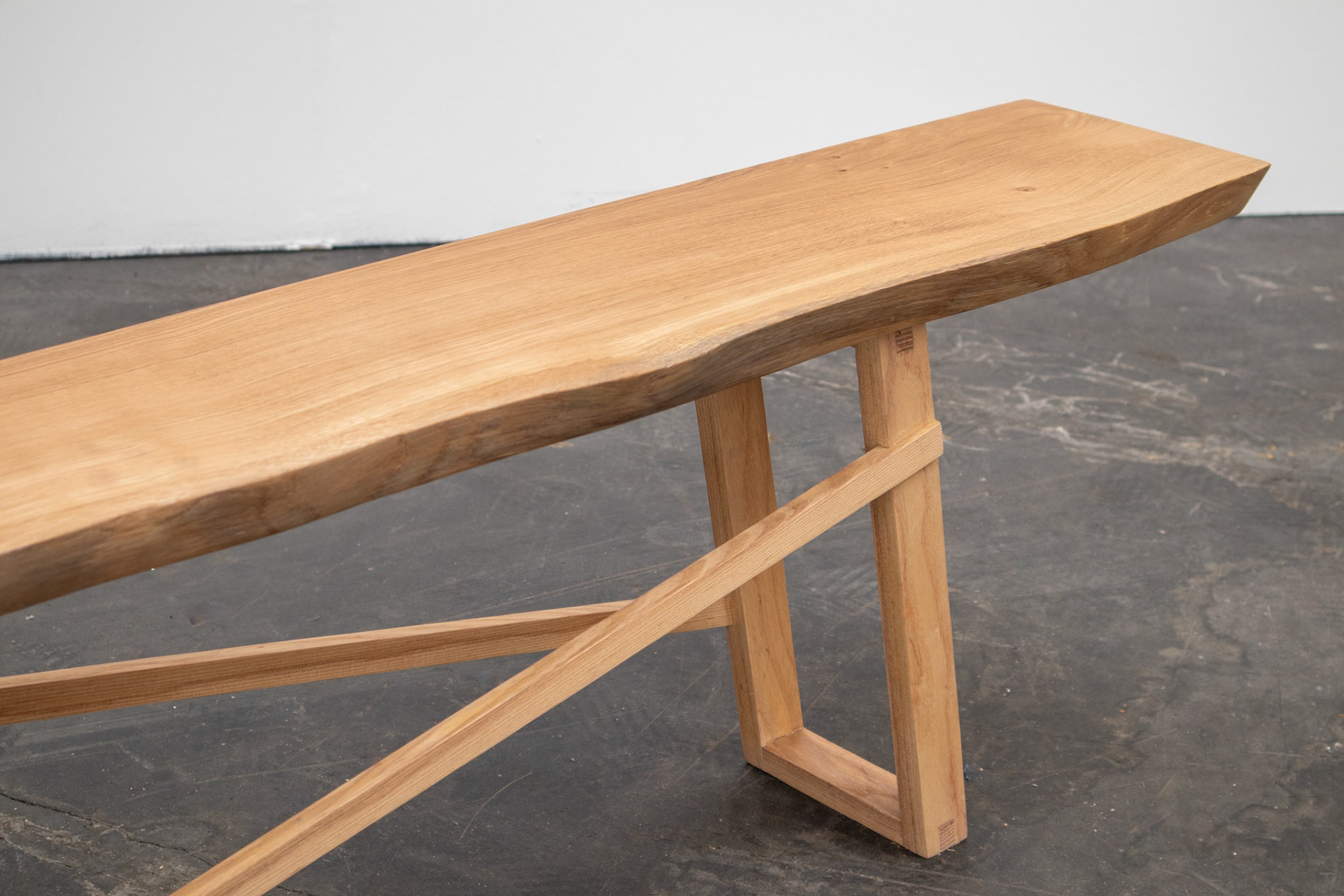 Slim profile bench made from a solid live-edge oak slab, with reclaimed oak legs. Finished with clear hardwax oil