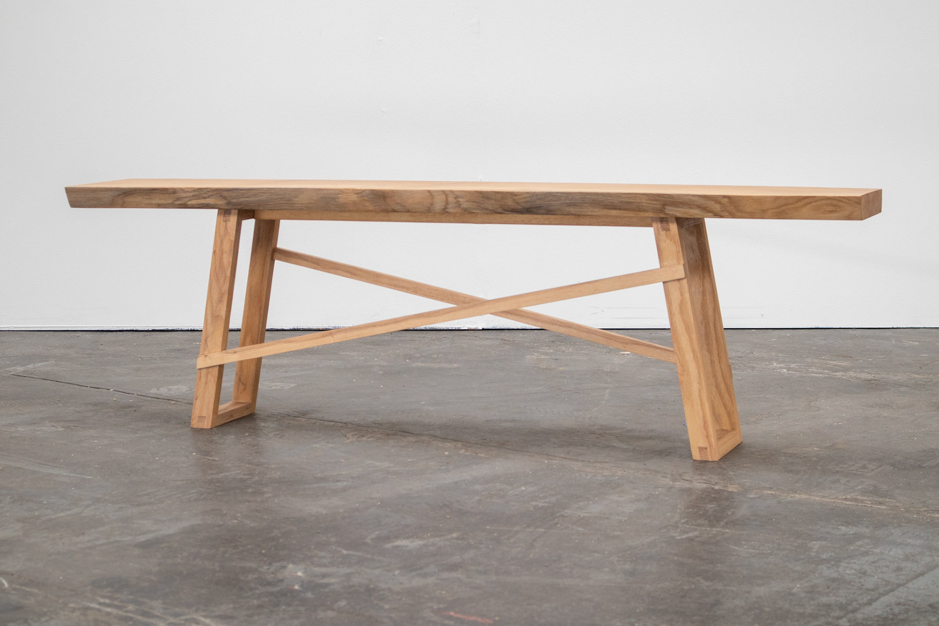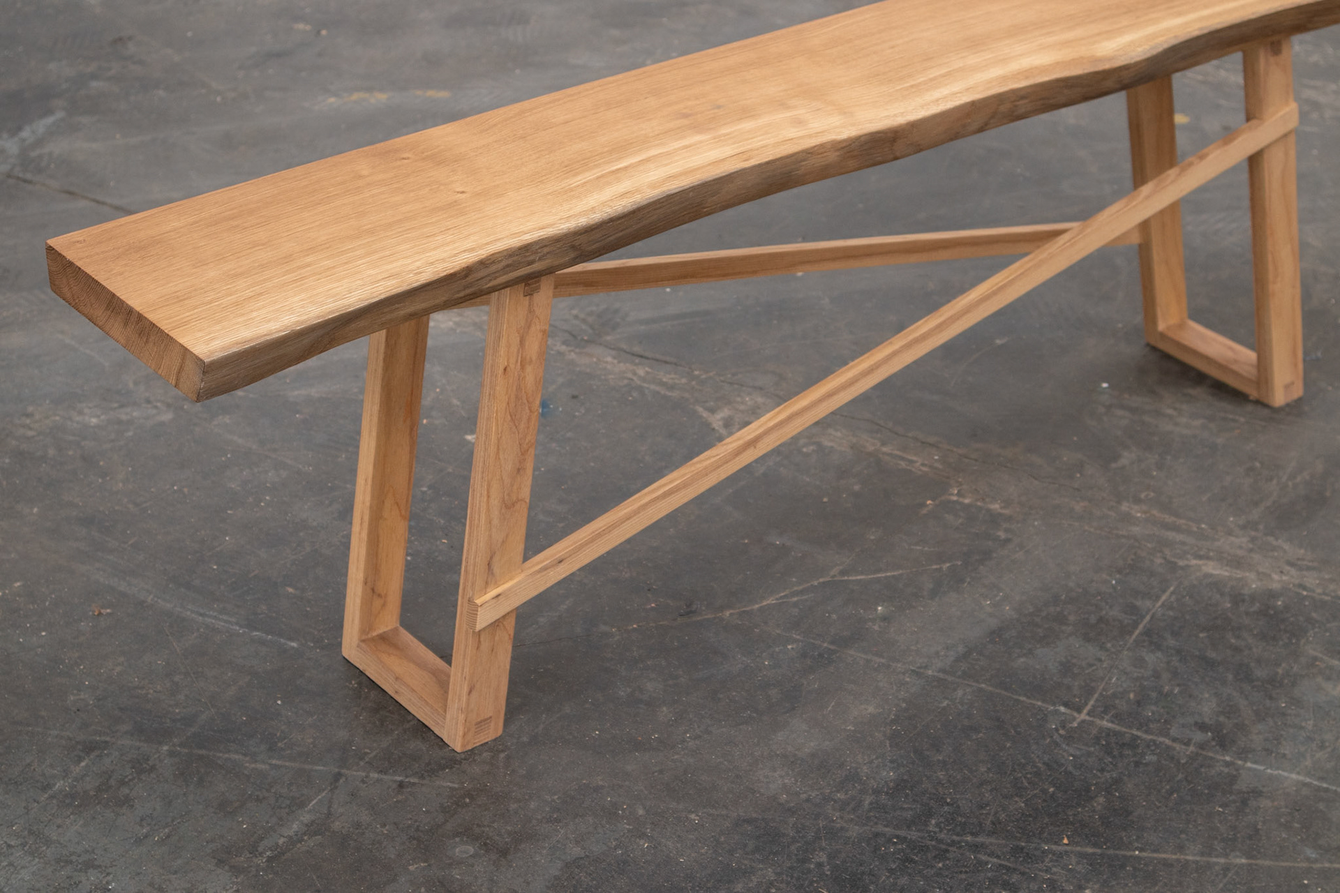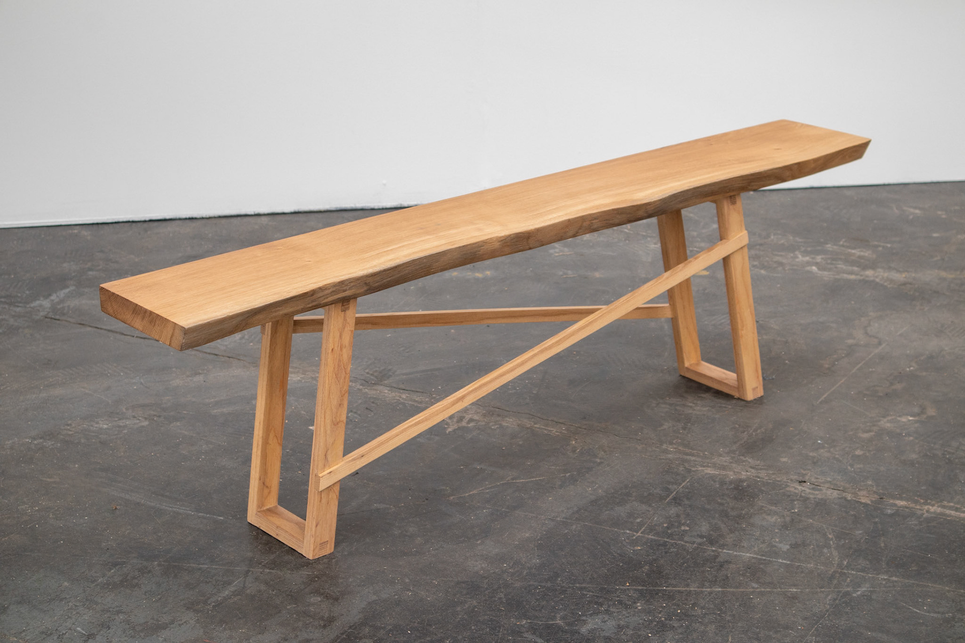 Slim profile bench made from a solid live-edge oak slab, with reclaimed oak legs. Finished with clear hardwax oil